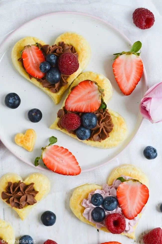 Tudi te premažemo z beljakom in sredino, tam kjer smo izrezali manjši srček, dobro prebodemo z vilicami.