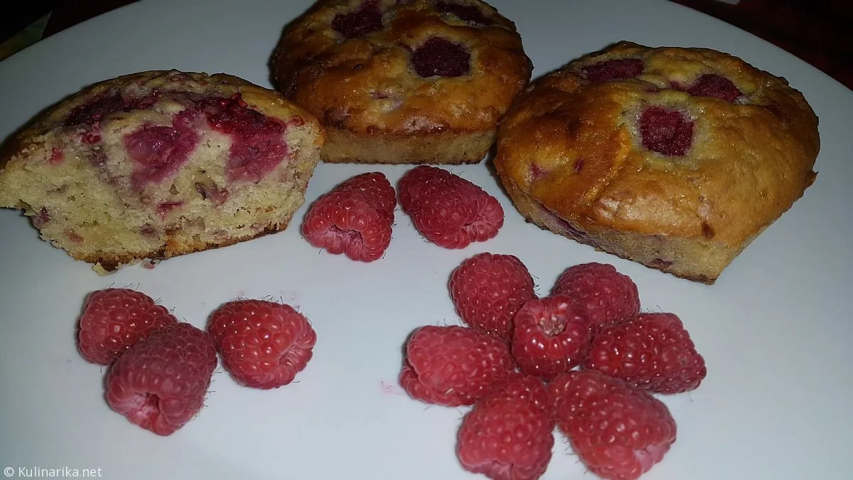 4. Modelčke za mafine polnimo do 2/3, vsakega po vrhu okrasimo z dvema ali tremi malinami.