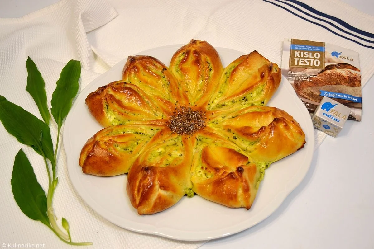 2. Med vzhajanjem pripravimo nadev. Feta siru dodamo kislo smetano, nasekljane lističe čemaža in polovico stepenega jajca (drugo polovico prihranimo za premaz). Vse skupaj nato zmešamo še s paličnim mešalnikom, po potrebi primešamo drobtine.