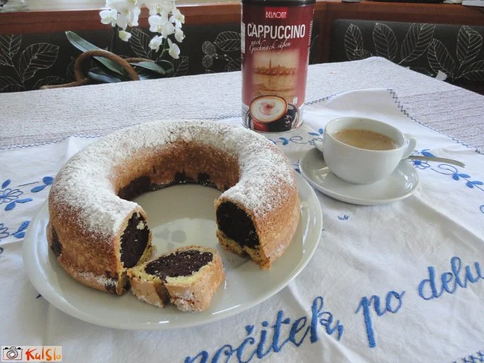 3. Polovico mase zlijemo v okrogel pekač (pekač za savarin). Ostali masi dodamo kakav in malo ruma ali gazirane vode in dobro premešamo. Zlijemo točno po sredini bele mase. Tako nastane v sredini skoraj pravilen črn krog, obdan z belim testom.