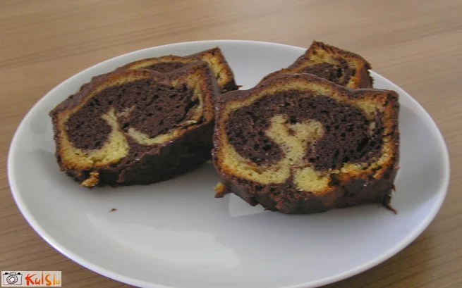7. Pekač namažemo z maslom in potresemo z moko, da se testo ne prime. V pekač najprej vlijemo del rumenega testa, nato kakavovo testo in še preostali del rumenega testa.
