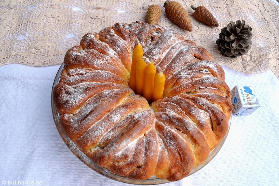 2. Vzhajano testo pregnetemo in pustimo nekaj minut počivati. Med tem zmešamo zmehčano maslo s sladkorjem in vanilinim sladkorjem. Nato ga razvaljamo, premažemo s sladkim maslom, posujemo rozine in zvijemo v zavitek. Zvitek položimo ob zunanjem robu okroglega pekača, tako da se oba konca stikata skupaj. Z nožem razrežemo zavitek na rezine in vsako rezino malo zamaknemo, da vsaka rezina prekriva predhodno, pri tem pa se pokaže malo »polžka« - plasti nadeva in testa. Oblikovan venec pustimo na toplem vzhajati.