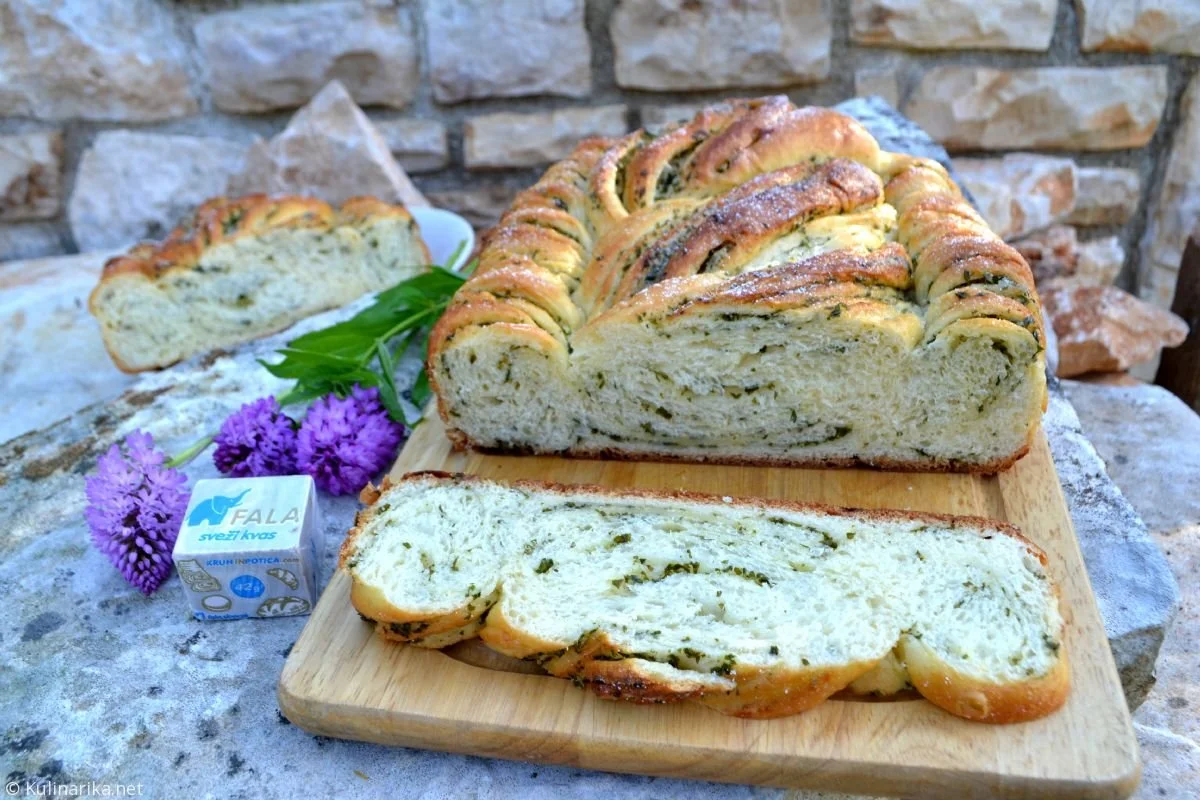 Nato odrežemo del zavitka, ki je nekoliko daljši od dolžine pekača. Prerežemo ga po dolžini na pol, tako da zarežemo približno 2 cm od roba in potegnemo rez do konca zavitka. Dobljeni polovici – oba pramena zavitka med sabo prepletemo in tako spleten zavitek položimo na sredino pravokotnega pekača na peki papir. Preostali del zavitka razrežemo na rezine, ki jih zložimo v prazen prostor ob obeh straneh pekača.