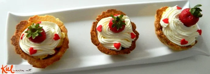Ohlajene košarice napolnimo z na kocke narezanimi jagodami, dodamo galleto, na koncu pa še sladko smetano.