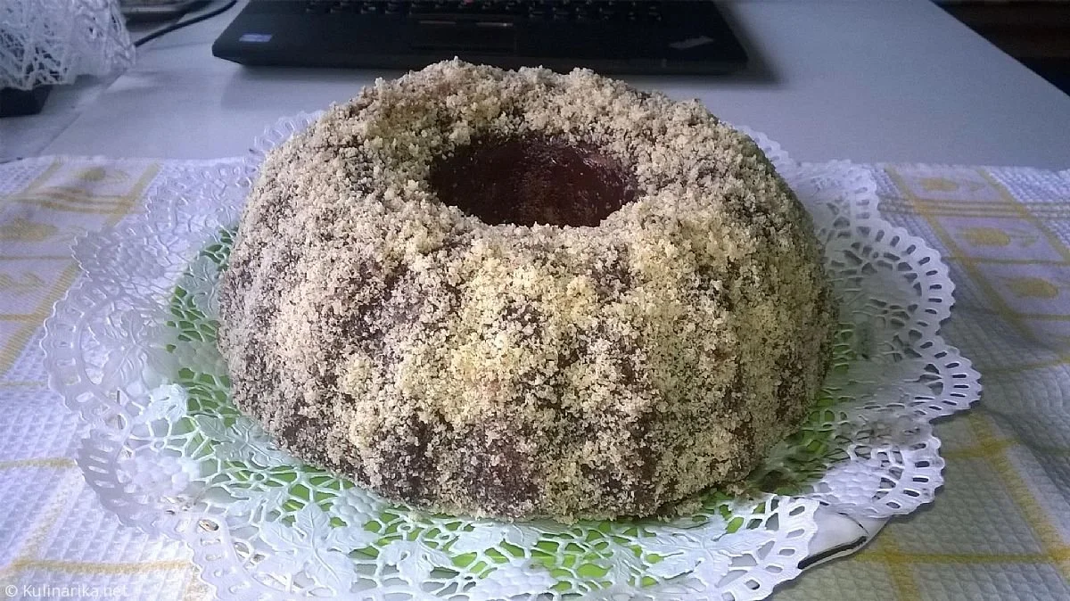 4. Po tem času zmanjšamo temperaturo na slabih 200 stopinj in pečemo še 20 minut. Kolač ohladimo v modelu (vsaj na mlačno) in ga nato zvrnemo na s sladkorjem v prahu posladkano površino.