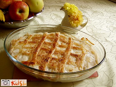 Nadev zlijemo na testo, po njem razporedimo izkoščičene suhe slive. Nadevamo še rezine jabolk, ki jih pokapljamo z rumom in premažemo s preostalo kislo smetano, ki smo ji primešali 2 žlici sladkorja.