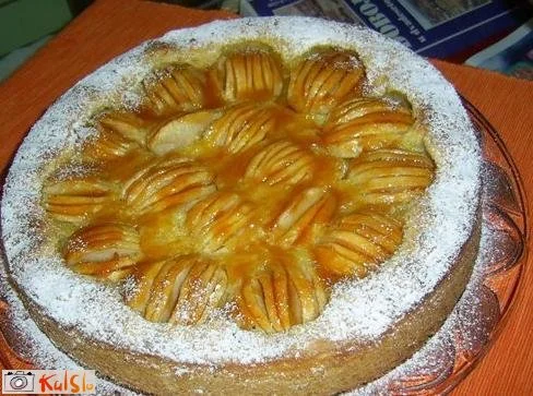 Iz večjega dela naredimo podlago za pecivo velikosti modela 26 cm. Iz drugega dela testa naredimo obliko kače in ga damo okoli podlage. Zdaj damo obroč na model za torto. Testo, ki smo ga dali okoli podlage za pecivo, malo pritisnemo ob obroč modela, tako da dobimo približno višino okoli 3 cm. Olupimo jabolka in jih razrežemo na 1/4, očistimo jih peščišč, vsak del jabolka na vrhu večkrat zarežemo in zložimo na testo.