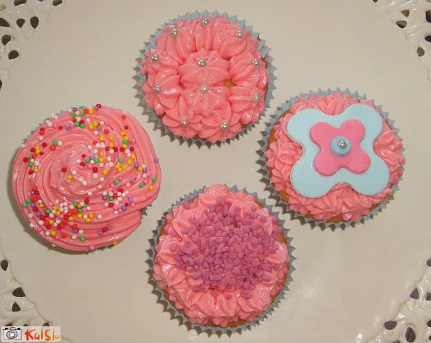Sladkor, vodo in limonin sok skuham do "nitke" ... to pomeni da ko maso zajamem s kuhalnico in počasi zlivam se curek zliva v nepretrgani nitki (upam, da je razumljivo ;)). Maso ohladim in jo zmešam k penasto vmešanemu maslu. To je osnovna krema, kateri lahko dodajamo določene sestavine in arome, ki kremi spremenijo ime in namen (kava, čokolada, lešniki, orehi,…). Zelo dobra je, če se namesto te sladkorne mase zmeša nutela, ker nima tako maslenega okusa, samo pol se jo ne da barvat. Mogoče pa lahko kera poskusi vmešat stopljeno belo čokolado ... taka masa bi se z lahkoto barvala :) Jaz pa barvam z barvami za živila, ki jih dobite v sparu ... 4 tubice v kompletu (sem pozabila katera firma, na škatlici je slika piškota v obliki muce in dve miški iz marcipana) ... no za te maffine sem uporabila malo rdeče barve in tako dobila roza.