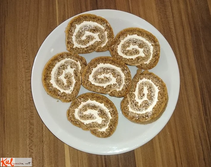 Ko se ohladi, odstranimo papir za peko in biskvit namažemo s kislo smetano in zvijemo v rolado, po vrhu jo lahko namažemo s kislo smetano in potresemo z mletimi orehi.