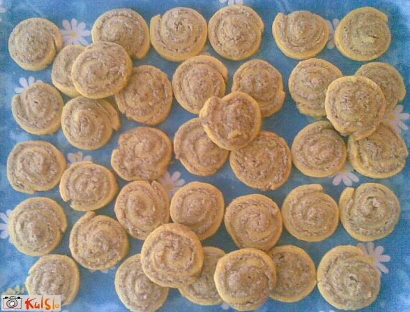 Vzhajano testo razvaljamo na prst debelo in ga namažemo z nadevom. Ko smo ga namazali, ga od vsake strani proti sredini zvijemo, tako, da dobimo na sredini dvojni zvitek, ki ga nato narežemo na kolobarje.