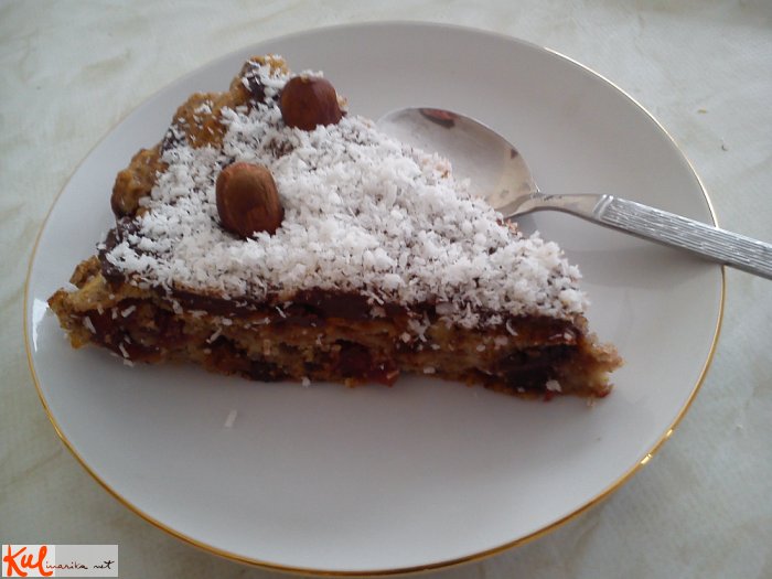 Moko zmešamo s pecilnim praškom, dodamo mlete lešnike, mleko, rozine in brusnice. Dodamo stopljeno maslo, naribani jabolki in 100 g grobo sesekljane čokolade. Dobro premešamo in stresemo v tortni model, ki smo ga obložili s papirjem za peko. Pečemo približno 45 minut na 180 stopinj. Ko je pita pečena, v vodni kopeli stopimo preostalo čokolado (da se lepše stopi, ji dodamo malo masla) in z njo premažemo pito. Po čokoladi potresemo kokosovo moko in okrasimo s celimi lešniki. Počakamo, da se čokolada strdi.