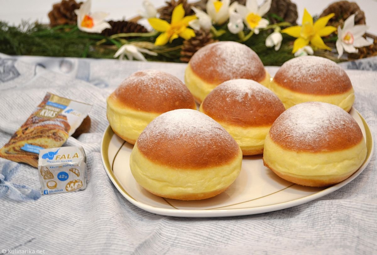 S penovko poberemo pečene krofe iz posode, pustimo nekaj minut in pustimo, da vročina do konca prodre do sredine. Nato jih napolnimo z marelično marmelado, povsem ohlajene posujemo z mletim sladkorjem.