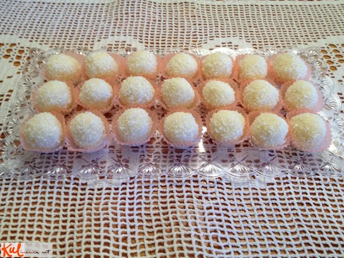 Smetano zavremo z medom, vanilinim sladkorjem in sladkorjem v prahu. Dodamo kokosovo moko in kuhamo s stalnim mešanjem 5 minut. Odstavimo, dodamo rum, ohladimo. Damo za pol ure v zamrzovalnik. Če masa ni dovolj gosta, dodamo še kokosovo moko.