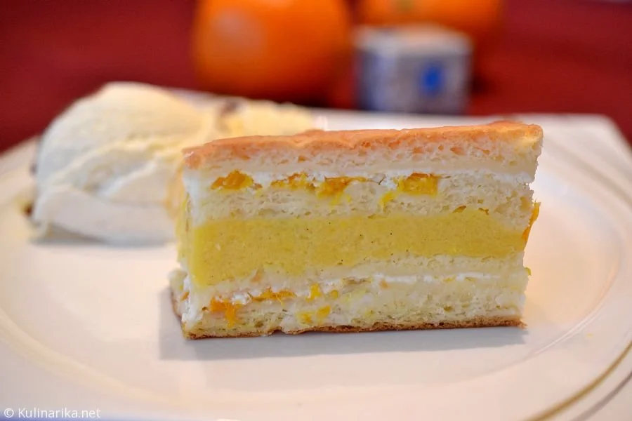 Skutni nadev: štiri beljake stepemo v trd sneg, postopno dodajamo 12 dag sladkorja. Smetano in skuto zmešamo z 9 dag sladkorja in primešamo polovico snega. Drugo polovico prihranimo za vaniljev nadev. Pomaranče olupimo, vsaki rezini odstranimo kožico in po želji razrežemo na koščke.