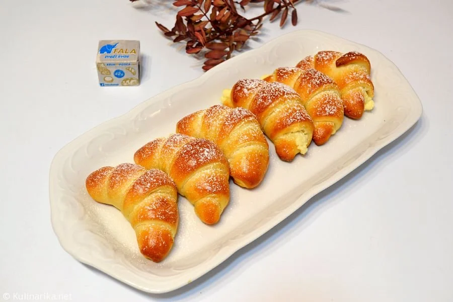3. Vzhajano testo stresemo na pult, ga pregnetemo, razdelimo na šest delov in pustimo nekaj minut počivati. Nato vsak kos testa razvaljamo na krog, tega razrežemo na osem enakih delov (trikotnikov). Na zunanjo stran vsakega trikotnika položimo žličko nadeva in zato trikotnik zvijemo v rogljiček v smeri od zunanje strani z nadevom proti notranjosti – konici trikotnika. Oblikovani zvitek dokončno oblikujemo v rogljiček in ga položimo na pekač. Nadaljujemo z zvijanjem ostalih trikotnikov v rogljičke in nato še z oblikovanjem vseh ostalih kosov testa.