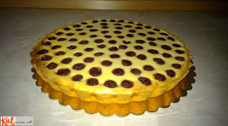 Temperaturo pečice znižamo na 175 stopinj. Nadev razporedimo po že prej pečenem testu, obložimo s sadjem in pečemo 60 minut.