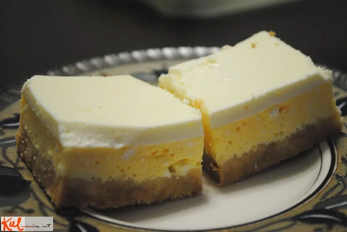 osvežilna sladica s skuto in kislo smetano na piškotni podlagi, brez dodatnih maščob.