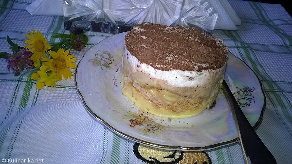 2. 3/4 kreme vlijemo v pripravljen pekač, ki ga malo potresemo, da se v njem poravna. Takoj nanjo naložimo (potresemo) nalomljene kekse, ki jih z žlico nalahno potisnemo v kremo. Na vrh položimo banane, ki smo jih prej prerezali po dolgem in nato na četrtine (glej sliko) in pokrijemo s preostankom kreme (zaprli bomo le ta velike luknje).