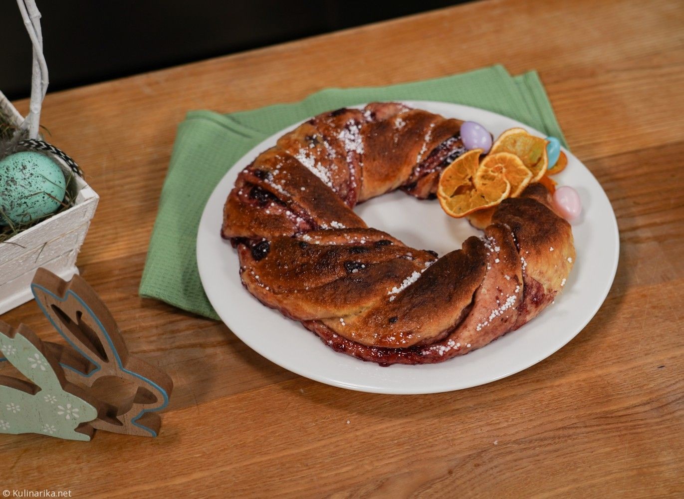 Z ostrim nožem zvitek prerežemo po dolžini, tako da ena stran ostane povezana. Polovice zložite tako, da je odrezani del obrnjen navzgor. Dele prepletajte enega čez drugega do konca testa. Okrogel model obložimo s papirjem za peko. Venček položimo v model tako, da je en konec pod drugim.