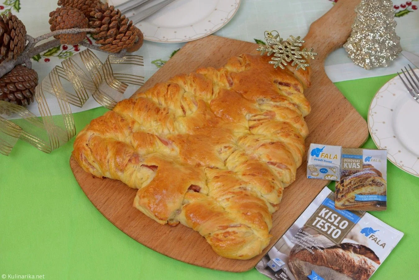 Vzhajano testo stresemo na pult, pregnetemo, razdelimo na štiri dele in pustimo počivati nekaj minut. Zatem vsak kos testa razvaljamo in izrežemo obliko smrekice. Prvo plast testa položimo na peki papir na pekač, ga premažemo s svežim sirčkom, obložimo s kuhanim pršutom in naribanim sirom. Obloženo testo prekrijemo z drugo plastjo testa, ponovno obložimo in ponovimo še enkrat z oblaganjem še tretje plasti testa. Na koncu položimo na vrh zadnjo plast testa. Zloženko v obliki smrekice še dokončno oblikujemo. Na obeh straneh testo razrežemo na ožje trakove; na sredini pustimo približno 3 cm testa nerazrezanega. Zatem vsak trak dva do trikrat obrnemo okrog svoje osi, da dobimo lep vzorec testa in nadeva in tako oblikujemo vsako vejo smreke. Ko smo vse trakove oblikovali v veje, pecivo pokrijemo in pustimo vzhajati.
