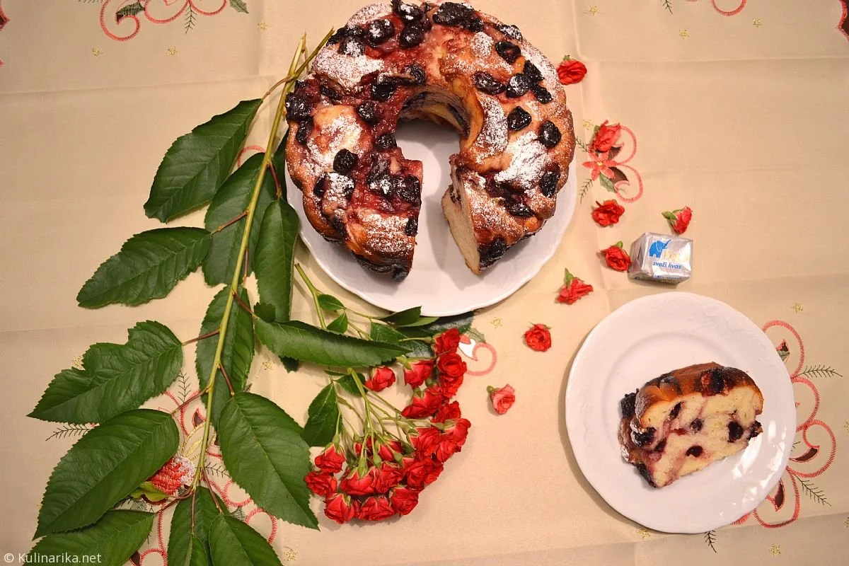 Zatem testo razvaljamo na pravokotnik, ga premažemo z nadevom, posujemo češnje, sladkor in zvijemo v zavitek. Nato zavitek prerežemo po dolžini na pol, tako da zarežemo približno 2 cm od roba in potegnemo rez do konca zavitka. Dobljeni polovici – oba pramena zavitka med sabo prepletemo in tako spleten zavitek položimo v pomaščen okrogel model za potico. Oblikovano pecivo damo na toplo vzhajati.