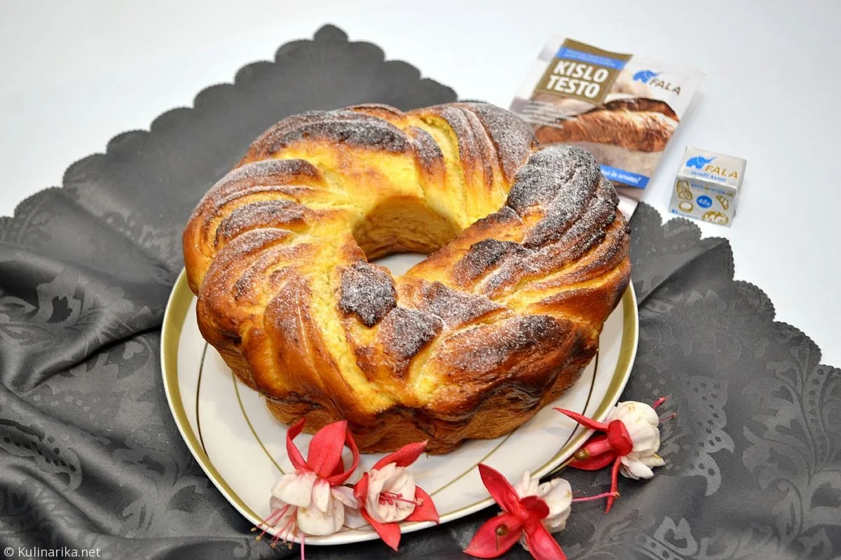 1. Kvas Fala raztopimo v toplem mleku. V posodo odmerimo sol, moko, ji primešamo kislo testo Fala, dodamo raztopljeni kvas in vse ostale sestavine brez masla ter zamesimo kvašeno testo. Najprej mešamo počasi, nato še deset minut na najvišji hitrosti. Med mešanjem postopno dodajamo zmehčano maslo. Ko je testo gladko, ga pokrijemo in pustimo na toplem vzhajati.