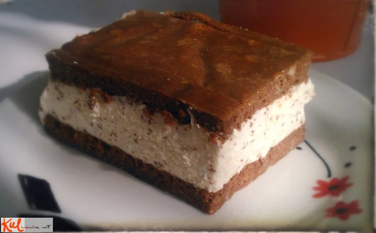 Ohlajeno testo razdelimo na dva dela (ne dve plasti, ampak polovico pekača) in na en del namažemo kremo, pokrijemo z drugim delom in damo v skrinjo. Kdaj vzamemo ven, je popolnoma po okusu in željah :), če želimo, sladoled pustimo, da zamrzne. Nam je najboljše le dobro ohlajeno, ne čisto zamrznjeno.