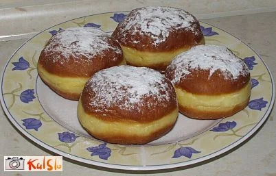 rum, jajca, olivno olje in sol. Gnetemo tako dolgo, da se testo loči od sklede. Pokrijemo in pustimo na toplem vzhajati 20 minut. Delovni pult pomokamo, testo razvaljamo na debelino 2cm. Izrežemo krogce premera 7cm. Zunanji rob premažemo z razžvrkljanim beljakom. Na sredino nadevamo marmelado, nanje narahlo položimo en krogec testa in robove previdno stisnemo skupaj. Na toplem naj pokriti počivajo 15 minut. Maščobo segrejemo na 175 stopinj. Krofe polagamo v maščobo obratno kot so počivali. V pokriti posodi jih cvremo 3 minute, nato še odkrite 3 do 4 minute. Krofke polagamo na pladenj na papirnate prtičke, da vsrkajo odvečno maščobo. Ohlajene potresemo z mletim sladkorjem.