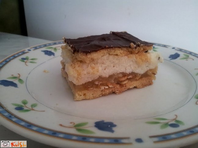 Prvi oblat, ki smo ga spekli, položimo v pekač ali v kovinski obod. Nanj namažemo breskov žele in pustimo, da se ohladi. Na žele namažemo zdrobovo kremo in pokrijemo z drugim oblatom. Čokolado in margarino stopimo nad parno kopeljo in z njo premažemo zgornji oblat. Pecivo postavimo v hladilnik, najbolje čez noč.