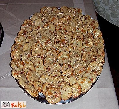 Testo tanko razvaljamo in izrežemo okrogle piškote premera cca. 4 cm. Pečemo jih na 200 stopinjah približno 5 - 7 minut, da rahlo porumenijo.