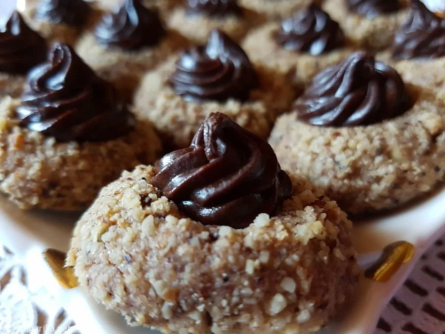 1. Pečico segrejemo na 180 stopinj. Sestavine za testo na roke zamesimo v testo, ki se ne lepi (po potrebi dodamo malenkost moke). Testo oblikujemo v kroglice, ki jih namočimo v beljaku in povaljamo v sesekljanih lešnikih. Nalagamo na pekač, ki smo ga obložili s peki papirjem. V vsako kroglico vtisnemo luknjo za nadev s prstom ali s kuhalnico. Pečemo 18 minut.