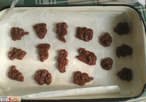 Najprej zmešamo jajca, sladkor in maslo, da nastane penasta mešanica. V skledo si pripravimo moko in jo zmešamo s pecilnim praškom, v manjši posodici pa zmešamo kakav in mleko, da nastane gosta in gladka kakavova masa. Moko zmešamo z jajci, sladkorjem in maščobo ter po dobrem ročnem mešanju (odlična vaja za moč roke) dodamo še mandlje in kokosovo moko ter kakavovo maso. Ko resnično dobro premešamo, je masa lepe čokoladno rjave barve in izrednega okusa. Maso lahko oblikujemo z roko, žlico, nožem, vilico ali jo s kuhinjsko injekcijo "nabrizgam" na pekač, obložen s peki papirjem ter postavimo za dobrih 10 minut v pečico, ogreto na 190 stopinj.