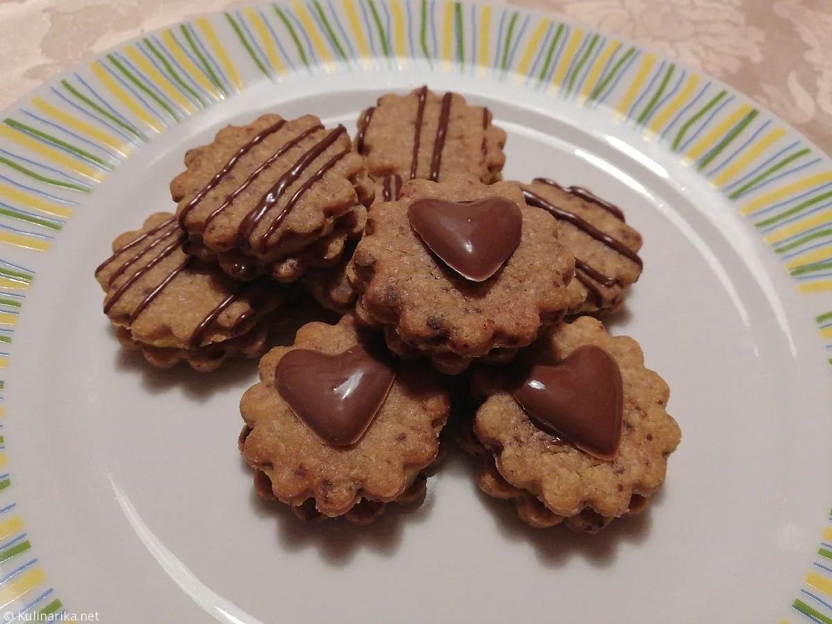 Iz sestavin zamesimo krhko testo, ga zavijemo v folijo in damo za nekaj časa v hladilnik. Pečico segrejemo na 180 stopinj in spečemo okrogle piškote premera cca. 4 cm.
