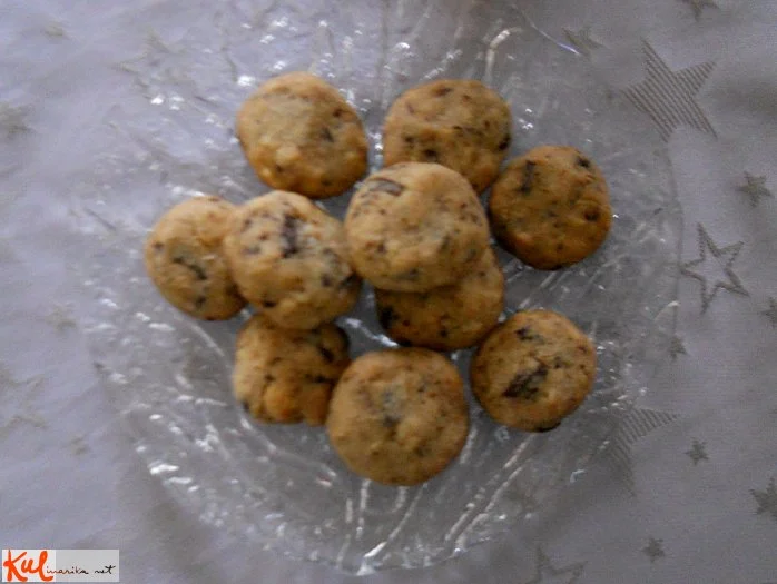 Iz vseh sestavin razen čokolade zamesimo testo in na koncu hitro umesimo še čokolado. Oblikujemo za oreh velike kroglice, ki jih sploščimo. Pečemo jih okoli 15 minut pri 180 stopinjah.