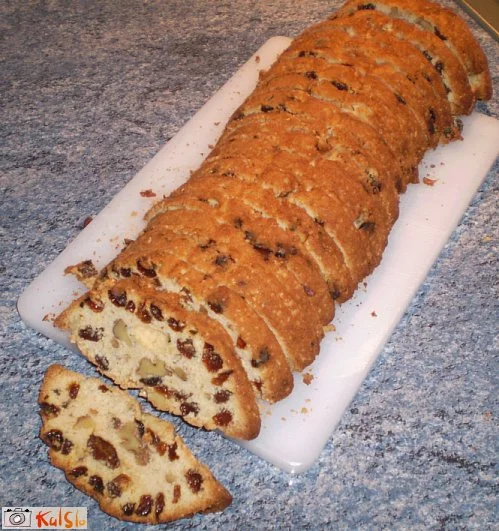 Orehe in rozine grobo nasekljamo, vse sestavine zmešamo. Nastala masa je precej lepljiva. Pekač obložimo s peki papirjem in na njem oblikujemo po vsej dolžini pekača (priloženega pečici) za dva prsta debele štruce, med njimi puščamo za dva prsta prostora, ker med peko narastejo. Pečemo približno 20 - 30 minut na temperaturi 180 stopinj. Ko se pecivo malce ohladi, vendar je še toplo, ga z ostrim nožem narežemo na približno centimeter široke rezine (prečno).