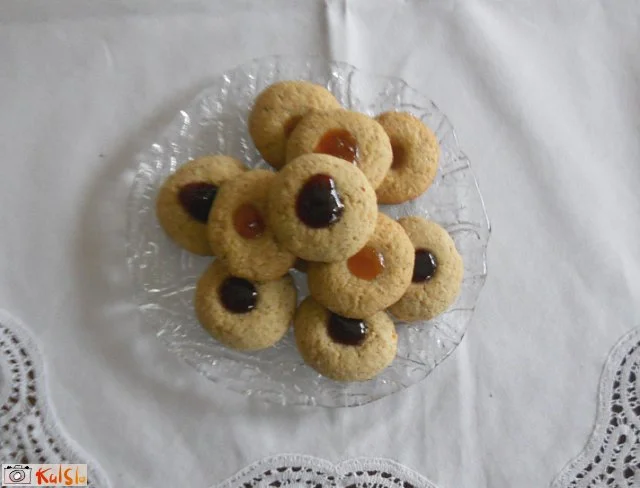 Oblikujemo kroglice enakomerne velikosti, jih rahko sploščimo in polagamo na pekač, ki smo ga pokrili s peki papirjem. S pomočjo npr. kuhalnice naredimo vdolbinico v vsako kroglico ter jo napolnimo z marmelado. Pečemo približno 15 minut v pečici ogreti na 180 stopinj. Pečene piškote polagamo na rešetko in ko so ohlajeni, jih narahlo potresemo s sladkorjem v prahu.