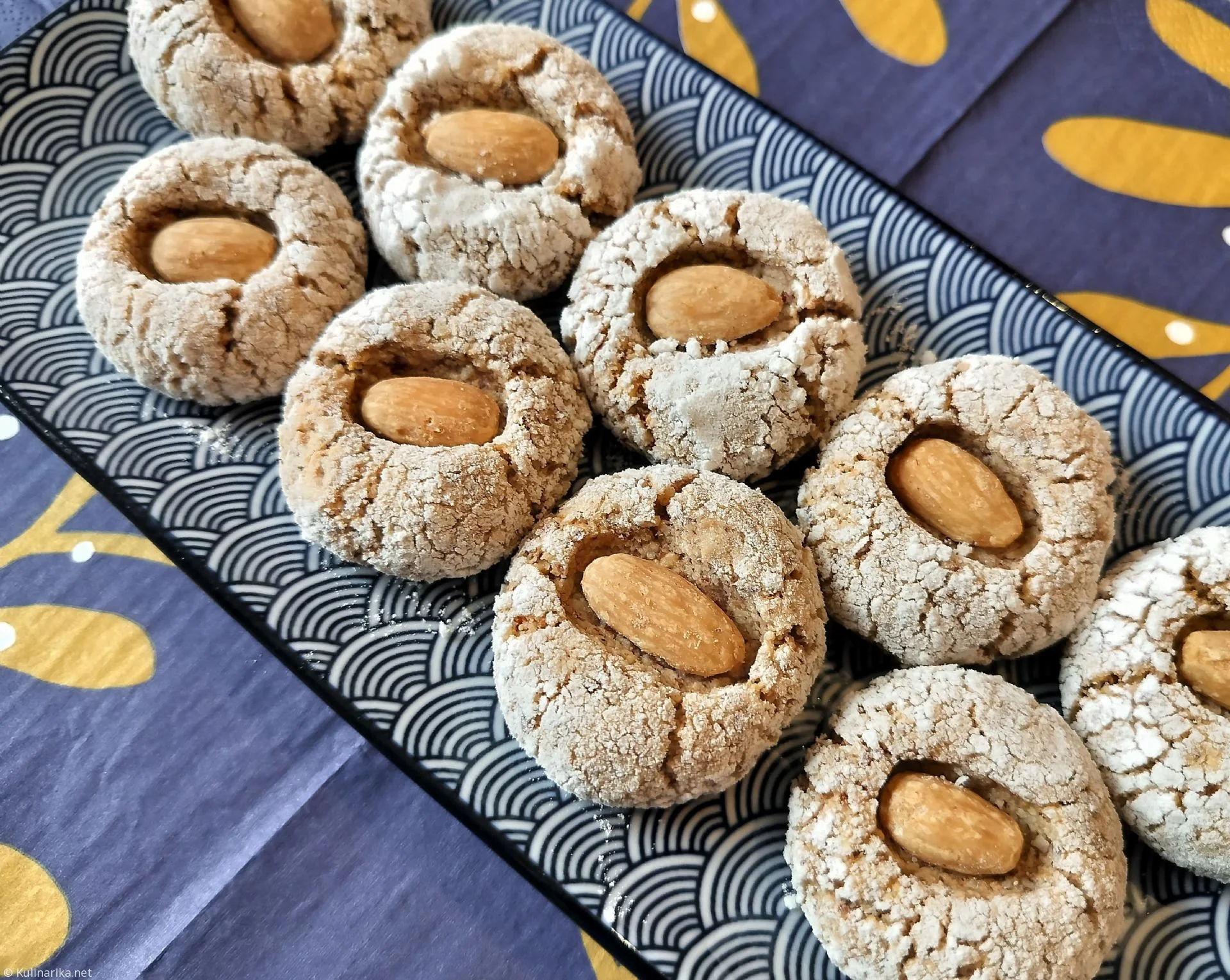 Vse sestavine, razen celih mandljev, zmešamo v homogeno zmes. Svaljkamo jih v kroglice (kot Rafaello), ki jih nato povaljamo v sladkorju v prahu. Kroglice postavimo na pekač (uporabite peki papir) in vanje potisnemo po en cel mandelj tako, da se kroglice sploščijo. Pečemo na 180 stopinjah cca. 10 minut.