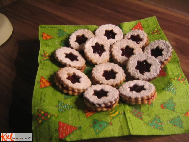 Zamesimo testo. Razvaljamo in izrežemo poljubne oblike. V polovico oblikovanih piškotov izrežemo luknjo poljubne oblike. Pečemo pri 180 stopinjah. Zgornje polovice še vroče potresemo s sladkorjem v prahu, da se prime testa. Ohlajene polovice namažemo s poljubno (kislo) marmelado.