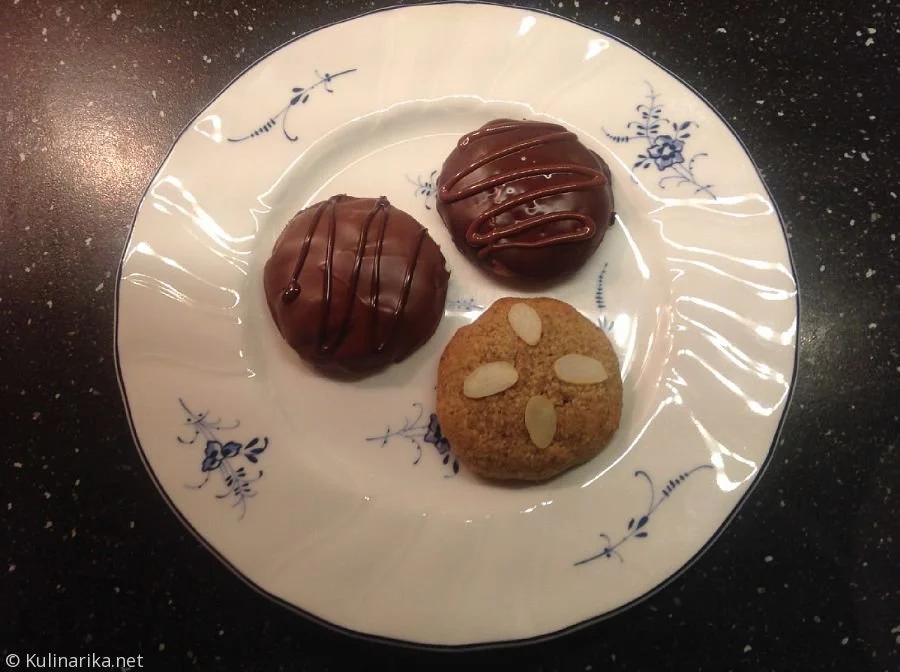 4. Po želji piškote prelijemo s čokoladno glazuro, najbolj enostavno jo pripravimo iz kuverture, ki jo raztopimo na vodni kopeli ali v mikrovalovni pečici. Piškote prelijemo z nekoliko ohlajenim prelivom in postavimo na hladno, da se glazura strdi.