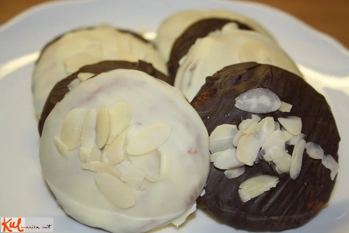 Temno in belo čokolado vsako posebej stopimo. S čopičem premažemo polovico medenjakov s temno in polovico z belo čokolado. Ko je čokolada še tekoča, jih posujemo z mandljevimi lističi.