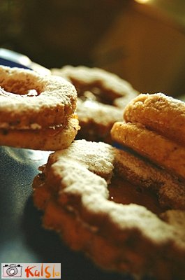 8. Piškote brez luknjic namažemo z marmelado. Piškote z luknjicami na ločenem krožniku posujemo s sladkorjem v prahu.