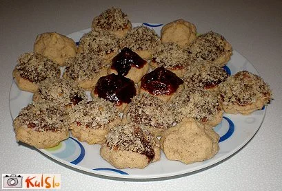V presejani moki razdrobimo margarino, dodamo našteta živila in jih hitro pognetemo v gladko testo. Testo nabrizgamo na pekač in pečemo pri 175 stopinjah od 8 - 10 minut. Ohlajenim vrh pomočimo v čokoladno glazuro in jih potresemo s sesekljanimi orehi.