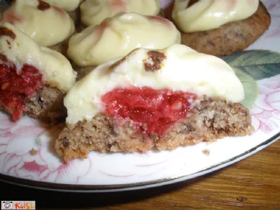 Z malinovo kremo napolnimo vdolbine v piškotih. Ker se bo tekočina vpila, ne varčujemo s kremo.