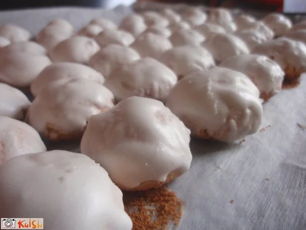 5. Za glazuro trdo stepemo beljak in sol. Postopoma vmešavamo tudi sladkor ter ostali češnjevec. Pečene piškote premažemo z glazuro ter jih spet položimo na pekača (obložena sta s peki papirjem) in v izključeni še topli pečici sušimo prbl. 4 minute.