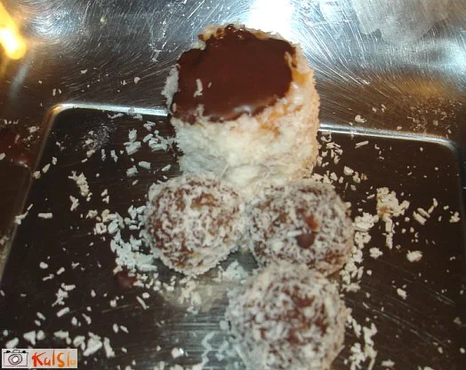 Videla sem še drugo različico ruskih kap.Pri strani so bile od kokosa, na vrhu in spodaj čokoladne, na vrhun na sredini čokoladnega kroga pa je bil lešnik, ki je verjetno predstavljal cof.