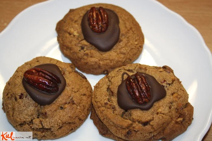 čokolado stopimo. Na kukije damo žličko čokolade, na katero damo karameliziran pekan. Počakamo, da se čokolada strdi.