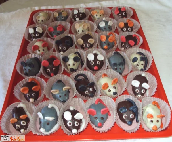 Biskvit nadrobimo v skledo, ga zalijemo z rumom in sokom. Dodamo maslo in sladkor v prahu. Primešamo stopljeno čokolado in damo maso za eno uro v hladilnik. Nato z rokami oblikujemo miške. Položimo jih na rešetko in jih oblijemo z rjavo, sivo in belo čokolado (belo čokolado pobarvamo z jedilno barvo in ji dodamo kanček rastlinske masti).