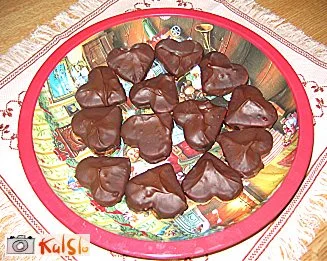 Zgornji srček potopimo v čokolado tako, da obenem pokrijemo tudi majhen delček spodnjega piškota (da je špranja med njima v kateri je marmelada, pokrita). Ohladimo, da se čokolada strdi.