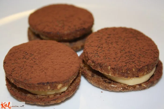 lešnikovi piškoti s kavo in čokolado, polnjeni s kremo iz bele čokolade in Baileys likerja