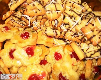 Testo razvaljamo na cca. 5 mm debelo (da je enakomerno zvaljano, si pomagamo z lesenimi ploščicami debelimi 5 mm, po katerih vodimo valjar). S pomočjo modelčkov (najlepša je rožica) izrežemo piškote, ki jih premažemo z jajcem. Na vsak piškot damo na sredimo polovico kandirane češnje in ga potresemo z mandljevimi lističi.